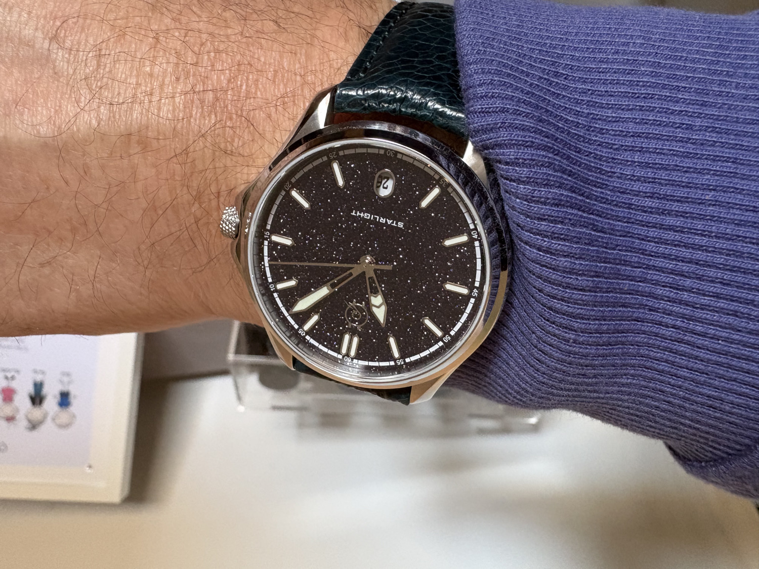 Additionally, the watch is protected by a flat sapphire crystal, which offers excellent scratch resistance and clarity. Rated at 5 ATM (50 meters) water resistance, the Starlight V2 is suitable for everyday activities, though it is not designed for swimming or diving.