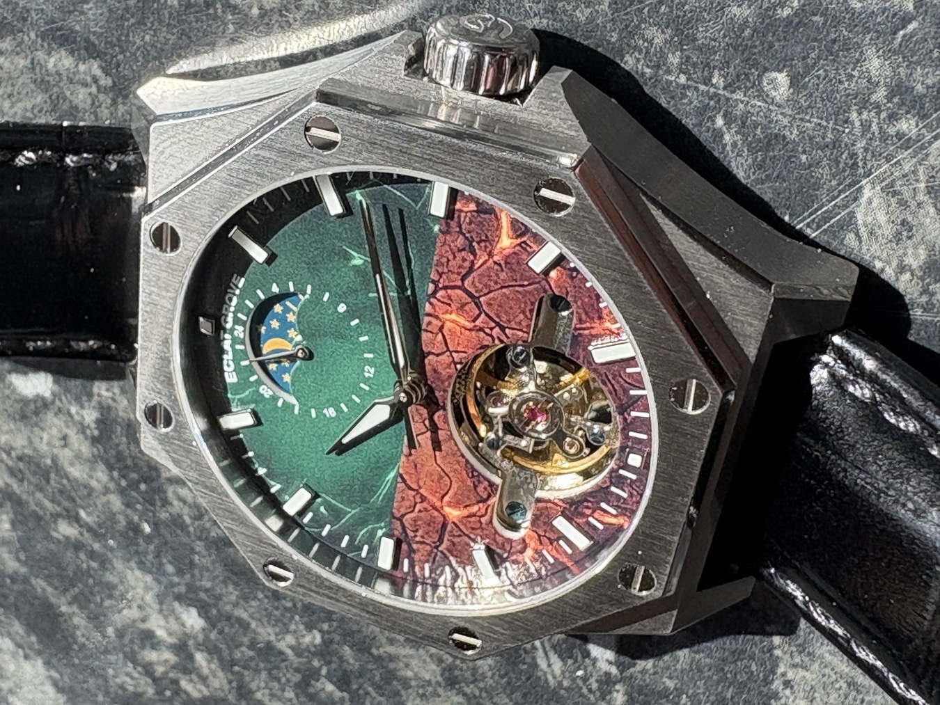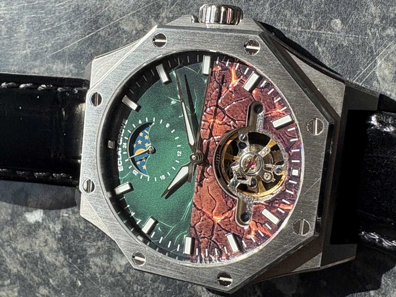 "The Eclat Grove Forest Guardian captivates with its duality of design—melding the raw, untouched beauty of nature with the refined precision of horological craftsmanship. Its octagonal bezel and visible screws speak to a rugged, industrial strength, while the dial's transition from verdant green to earthy red-brown narrates a story of renewal and hope."
