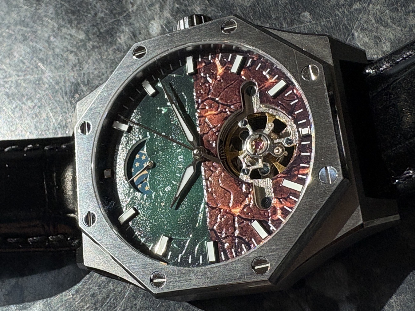 The octagonal bezel, accented by visible screws at each corner, lends the watch a robust, industrial aesthetic. This design choice underscores the watch's resilience and strength, mirroring the sturdiness of nature's elements. The bezel's geometric precision complements the organic motifs of the dial, creating a harmonious blend of natural and mechanical beauty.