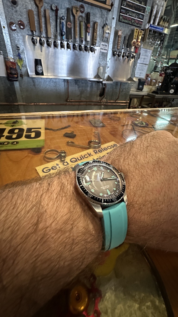For those who appreciate the finer details, the watch's lug width of 20mm allows for easy strap interchangeability, offering versatility in style. Whether paired with its original turquoise rubber strap or swapped for a leather or NATO strap, the Oris Divers Sixty-Five adapts effortlessly to any occasion, making it a versatile addition to any watch collection.