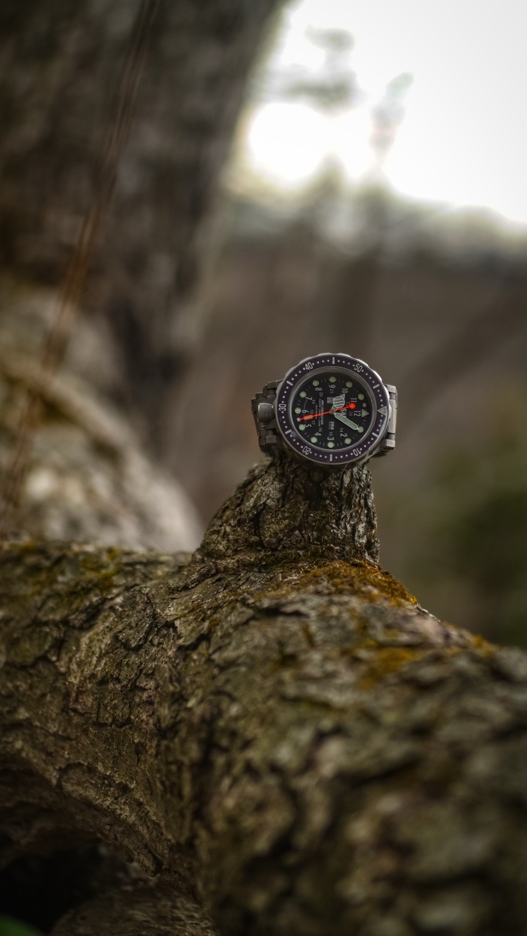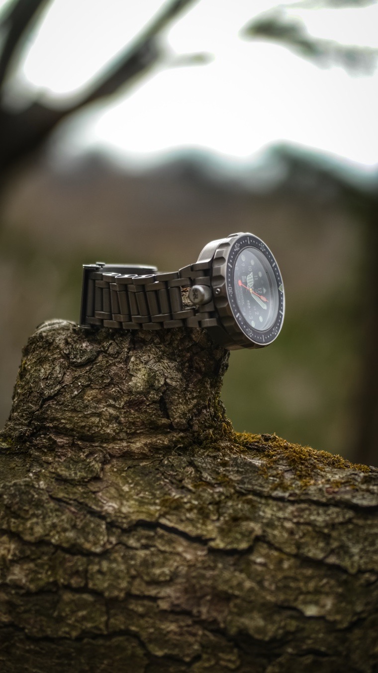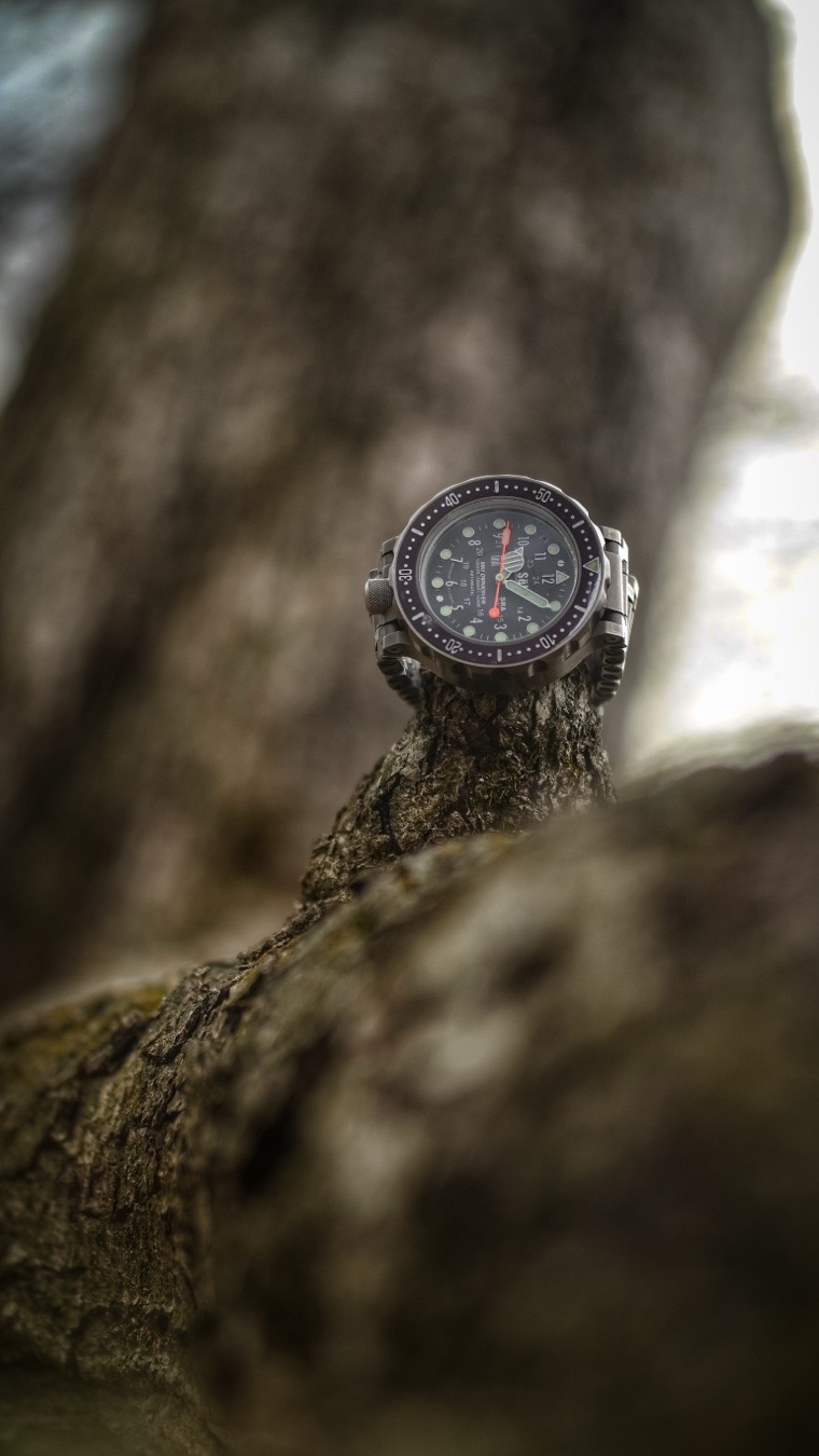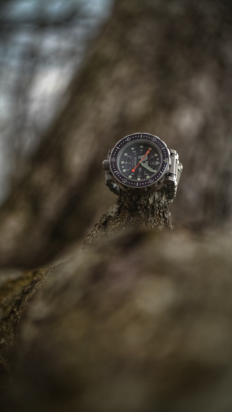 The SēL Instrument Omnidiver MK1 stands as a beacon of robust design and aesthetic allure. Its black dial is adorned with luminous markers that ensure readability even in the darkest depths. The dial's simplicity is its strength, offering a clear and uncluttered view that is both functional and visually appealing. The watch's 48mm case, crafted from Grade 5 titanium, offers a brushed finish that mimics the appearance of stainless steel, providing a sleek and modern look.