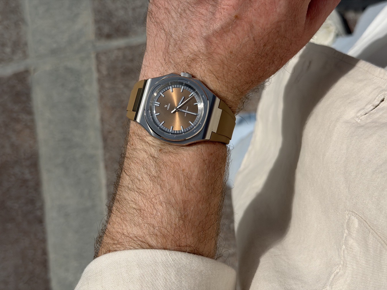The Yema Urban Traveller is an exquisite blend of modern design and timeless elegance. This particular variant, with its brown textured dial and beige rubber strap, stands out as a testament to Yema's commitment to innovative watchmaking. The dial's rich brown hue, accented by a textured pattern, provides a unique visual depth that captures light in intriguing ways, reminiscent of a sunray or embossed honeycomb style. This complexity is further enhanced by the polished, smooth bezel that contrasts beautifully with the brushed stainless steel case, adding a layer of sophistication to its overall appearance.