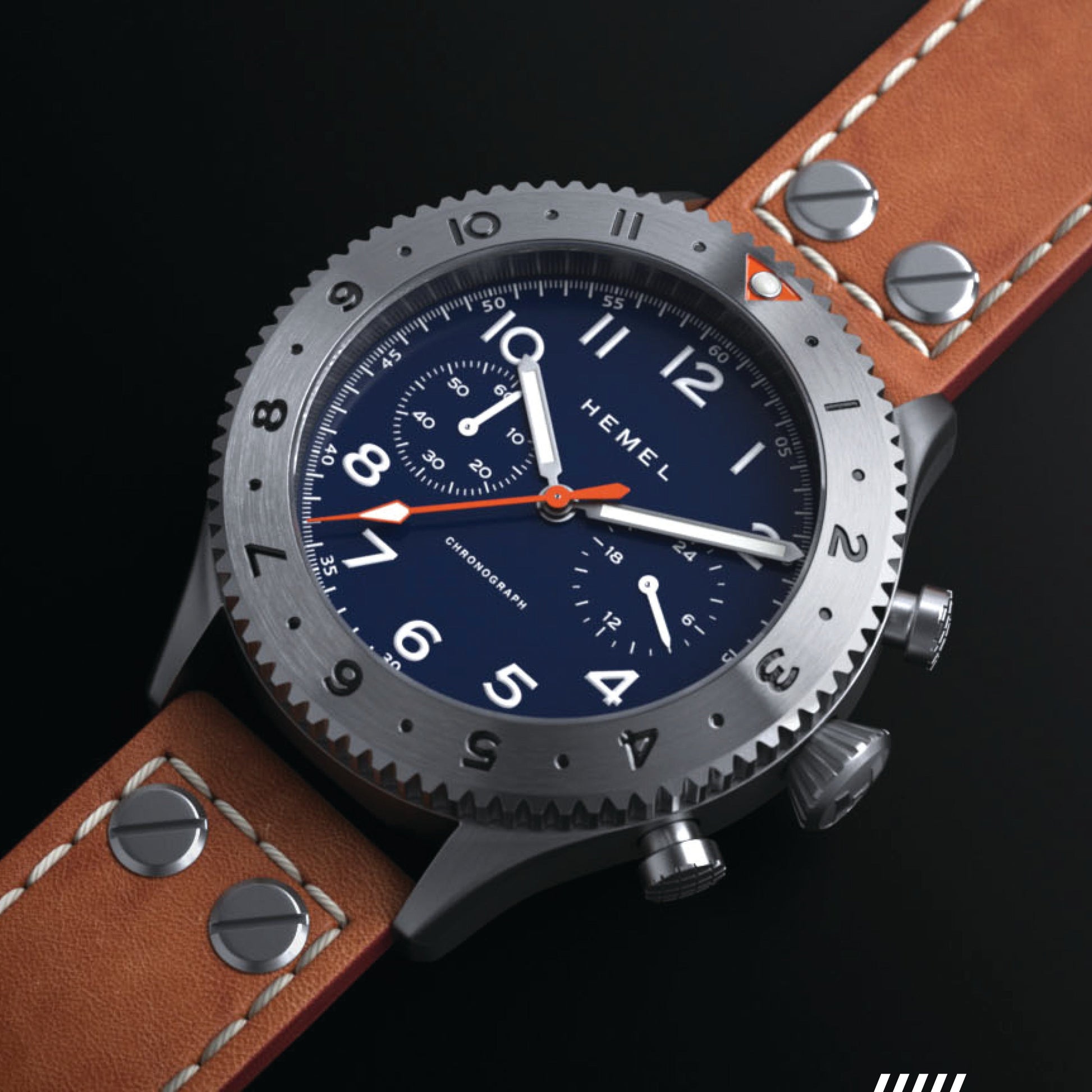 Why choose Hemel HFT20? It delivers the tactile thrill of a mechanical chronograph in a modern, reliable package—complete with a striking navy dial, sapphire crystal, and strong lume for visibility in any light. With 100 m water resistance and a versatile bezel setup, this watch is ready for everyday wear and weekend adventures alike.